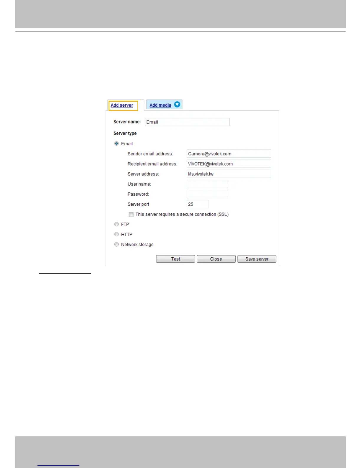 There are four choices of server types available: Email, FTP, HTTP, and Network storage.