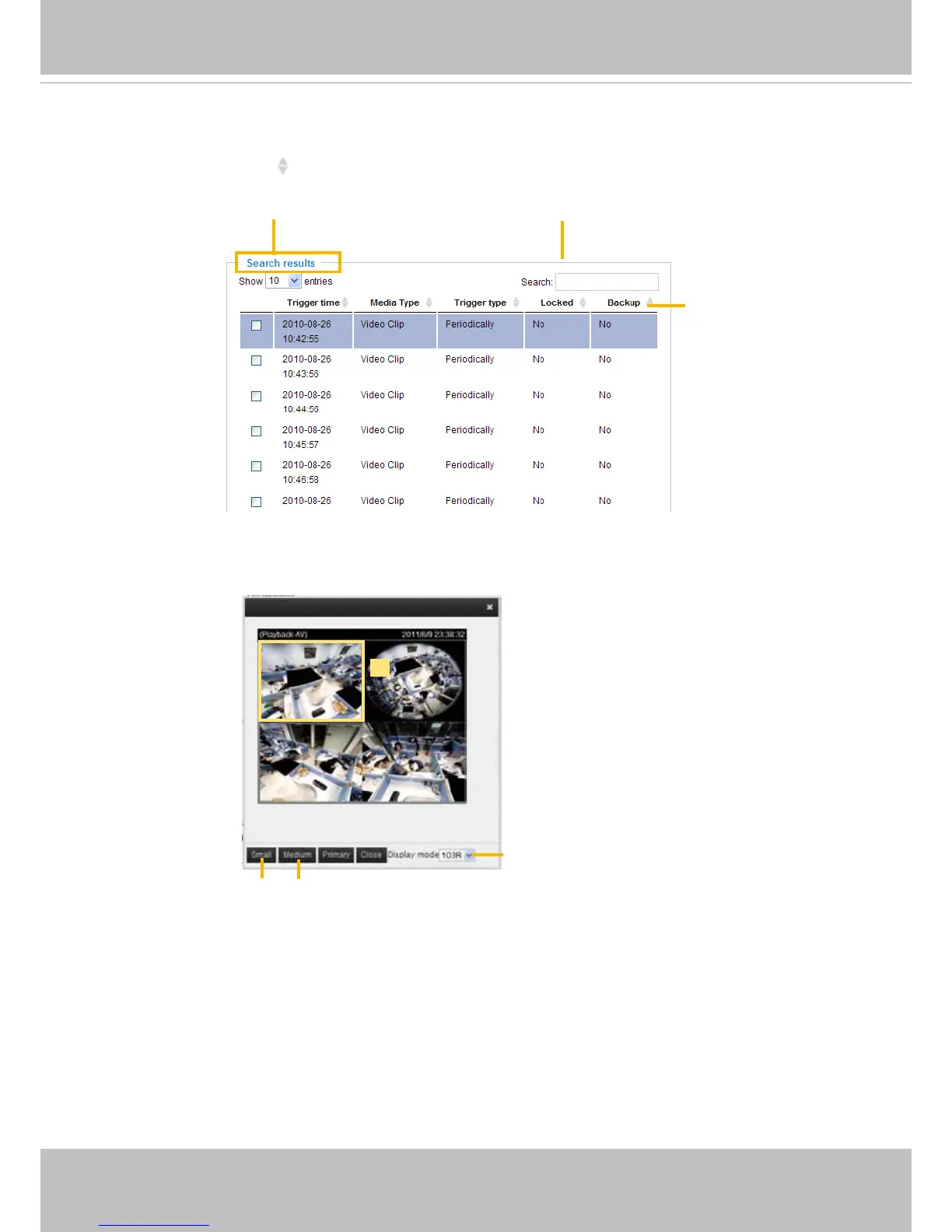 The following is an example of search results. There are four columns: Trigger time, Media type, Trigger