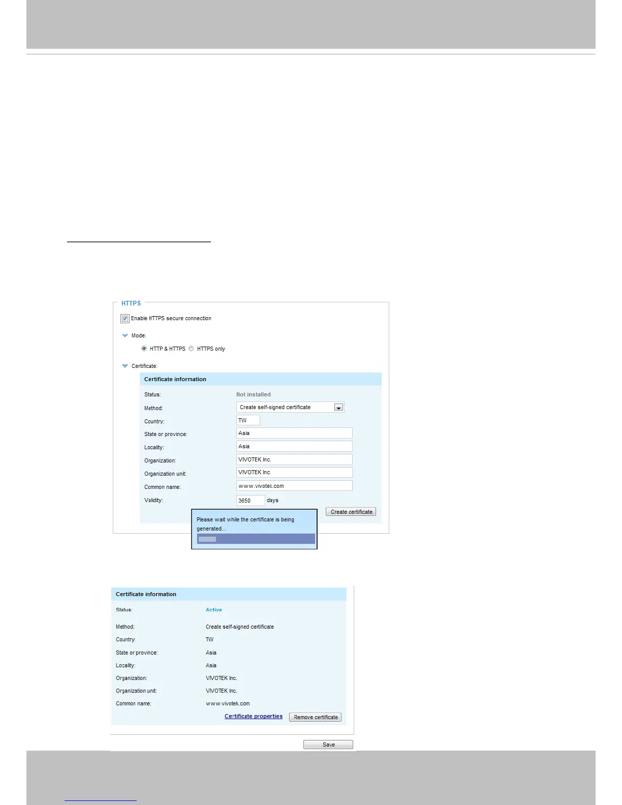 Before using HTTPS for communication with the Network Camera, a Certicate must be created rst.