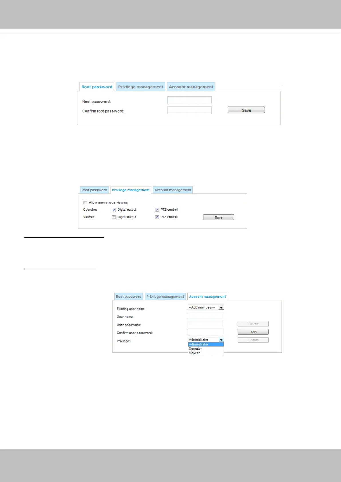 Digital Output & PTZ control: You can modify the management privilege as operators or viewers. Select