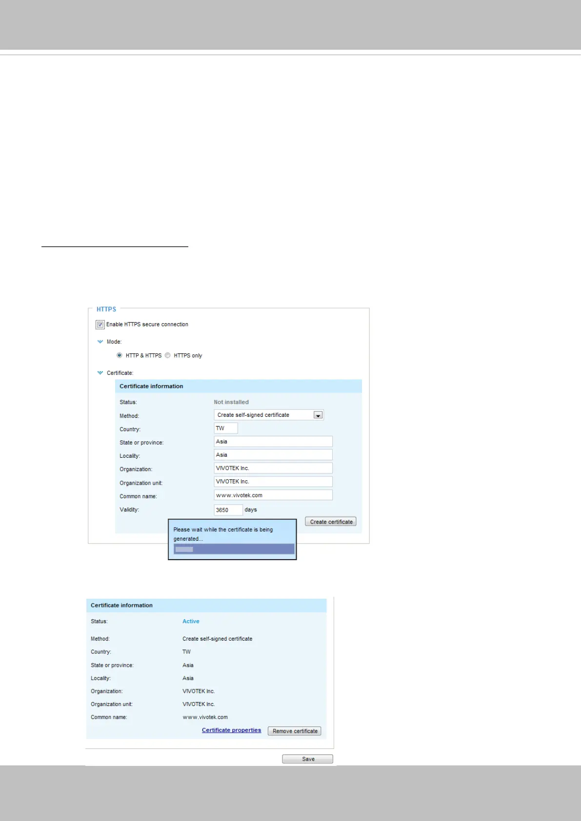 Before using HTTPS for communication with the Network Camera, a Certicate must be created rst.