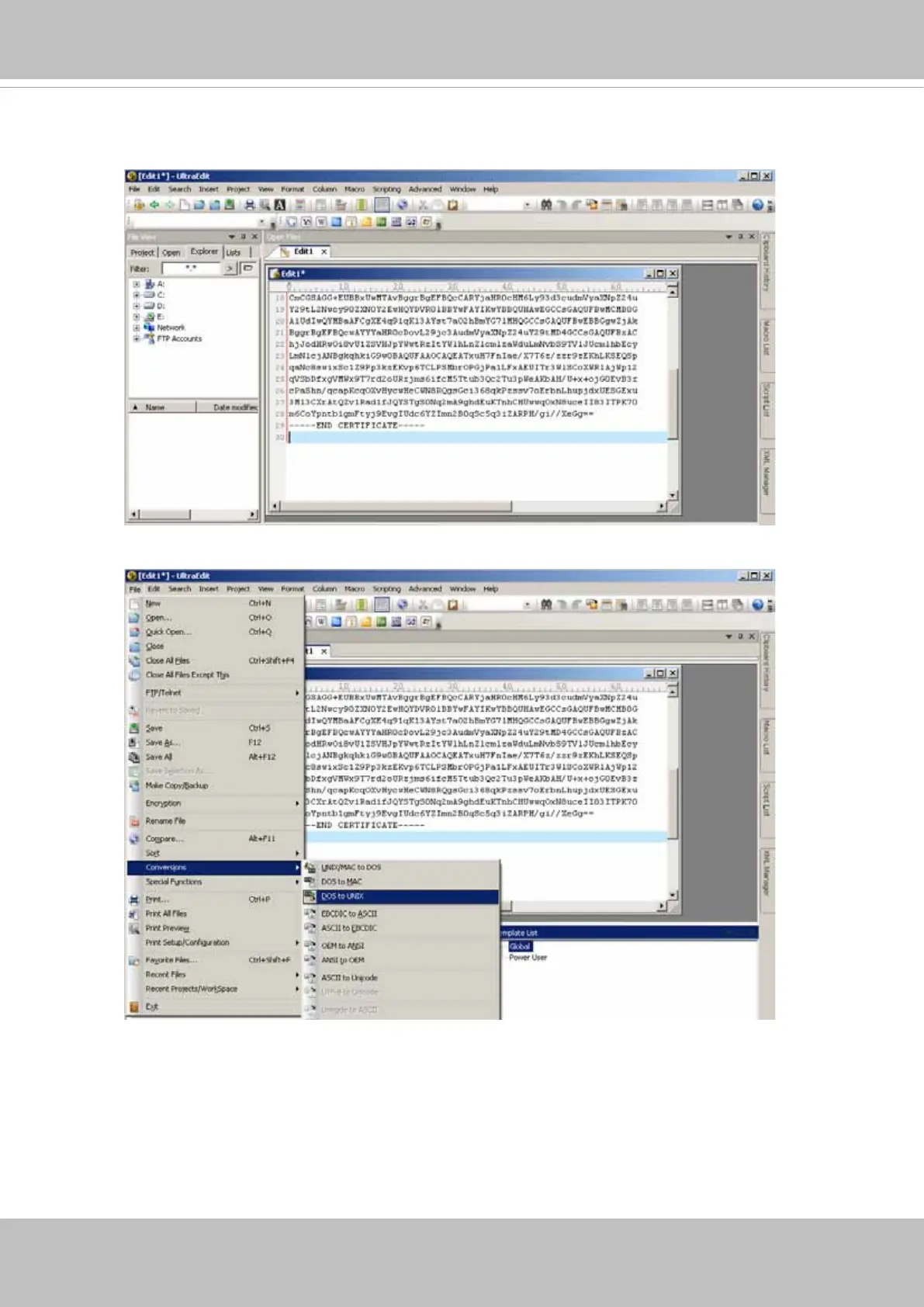 8. Convert le format from DOS to UNIX. Open File menu > Conversions > DOS to Unix.