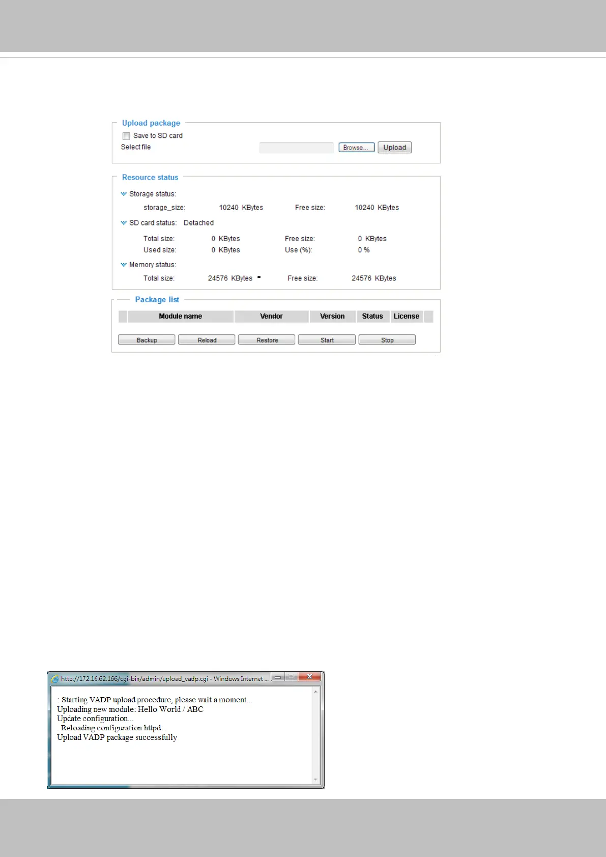 • Once the software package is successfully uploaded, the module conguration (vadp.xml)
