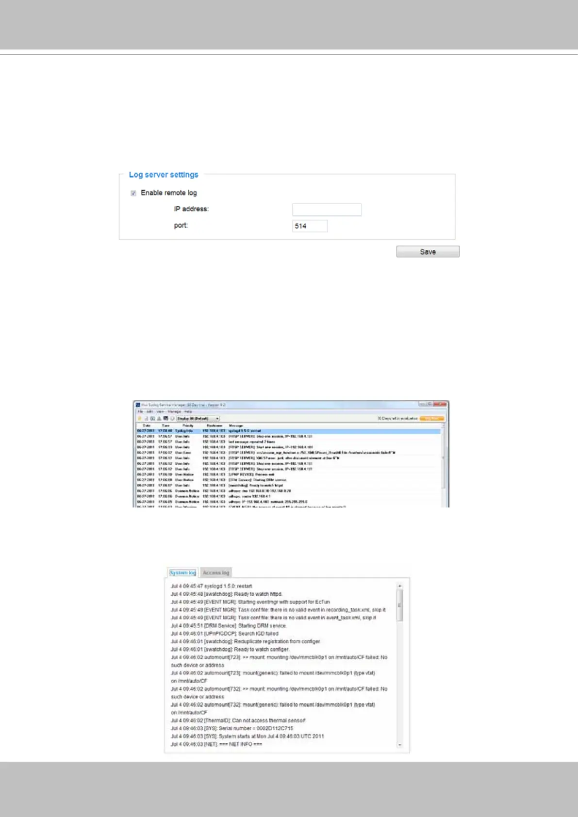 messages from the Network Camera. An example is Kiwi Syslog Daemon. Visit http://www.kiwisyslog.