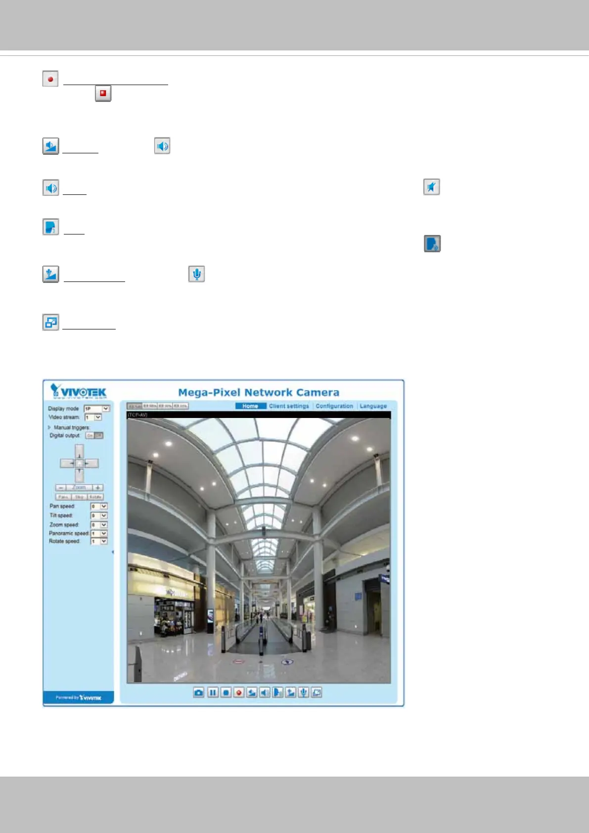 Talk: Click this button to talk to people around the Network Camera. Audio will project from
