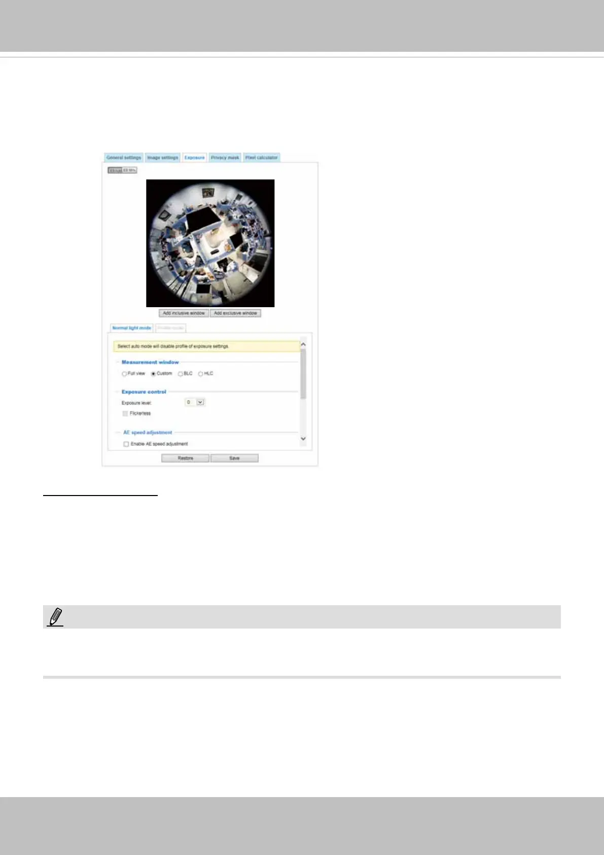 On this page, you can congure the Exposure measurement window, Exposure level, Exposure mode,