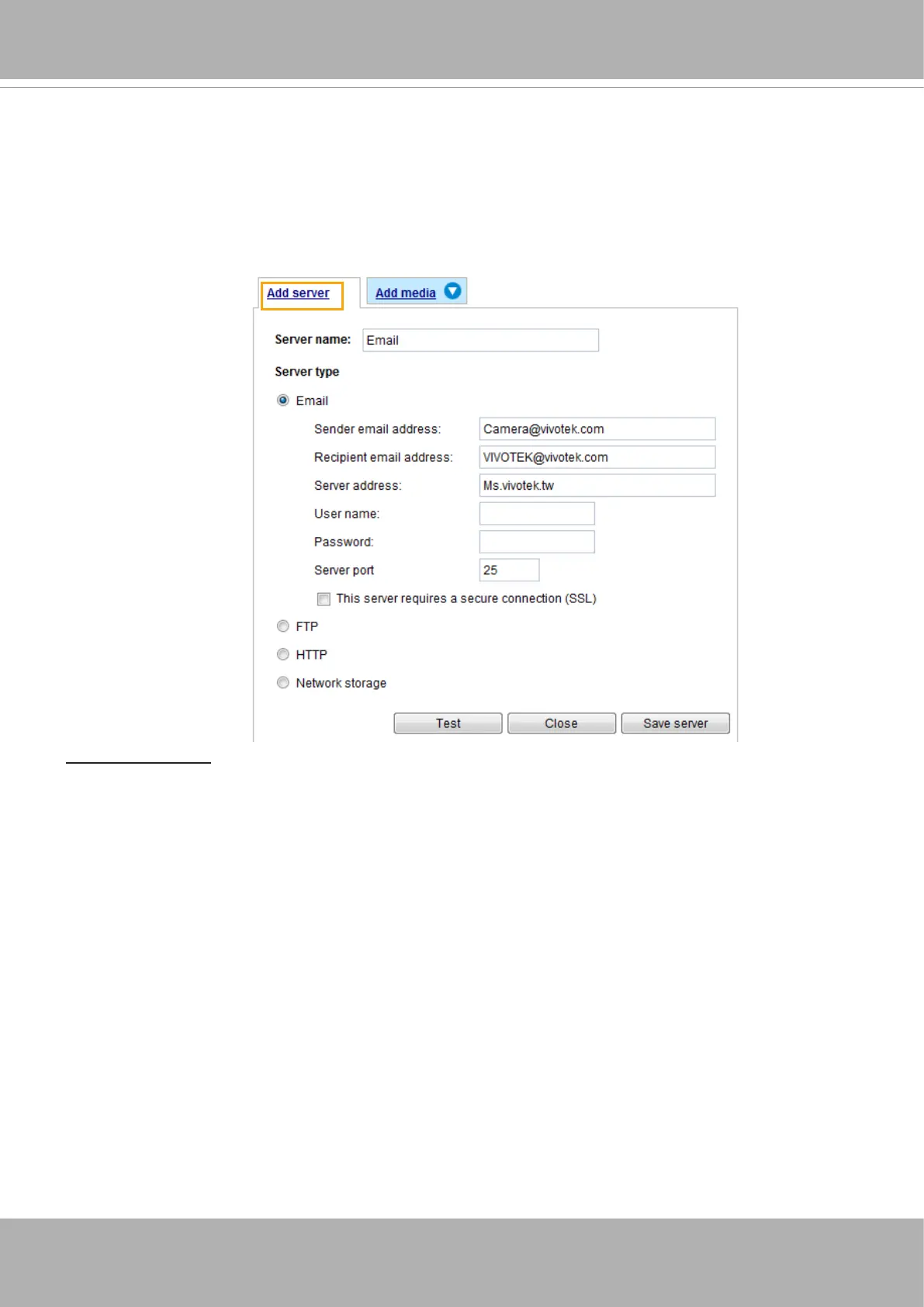 There are four choices of server types available: Email, FTP, HTTP, and Network storage.