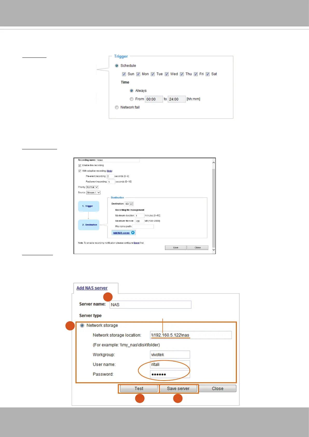 ■ Schedule: The server will start to record les on the local storage or network attached storage (NAS).