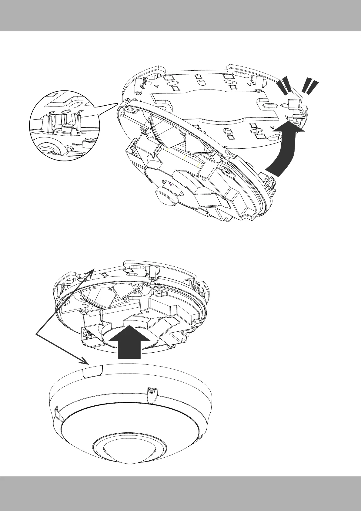 15. Secure the camera to the base plate by aligning the snap-in tabs. Press until the snap-in tabs