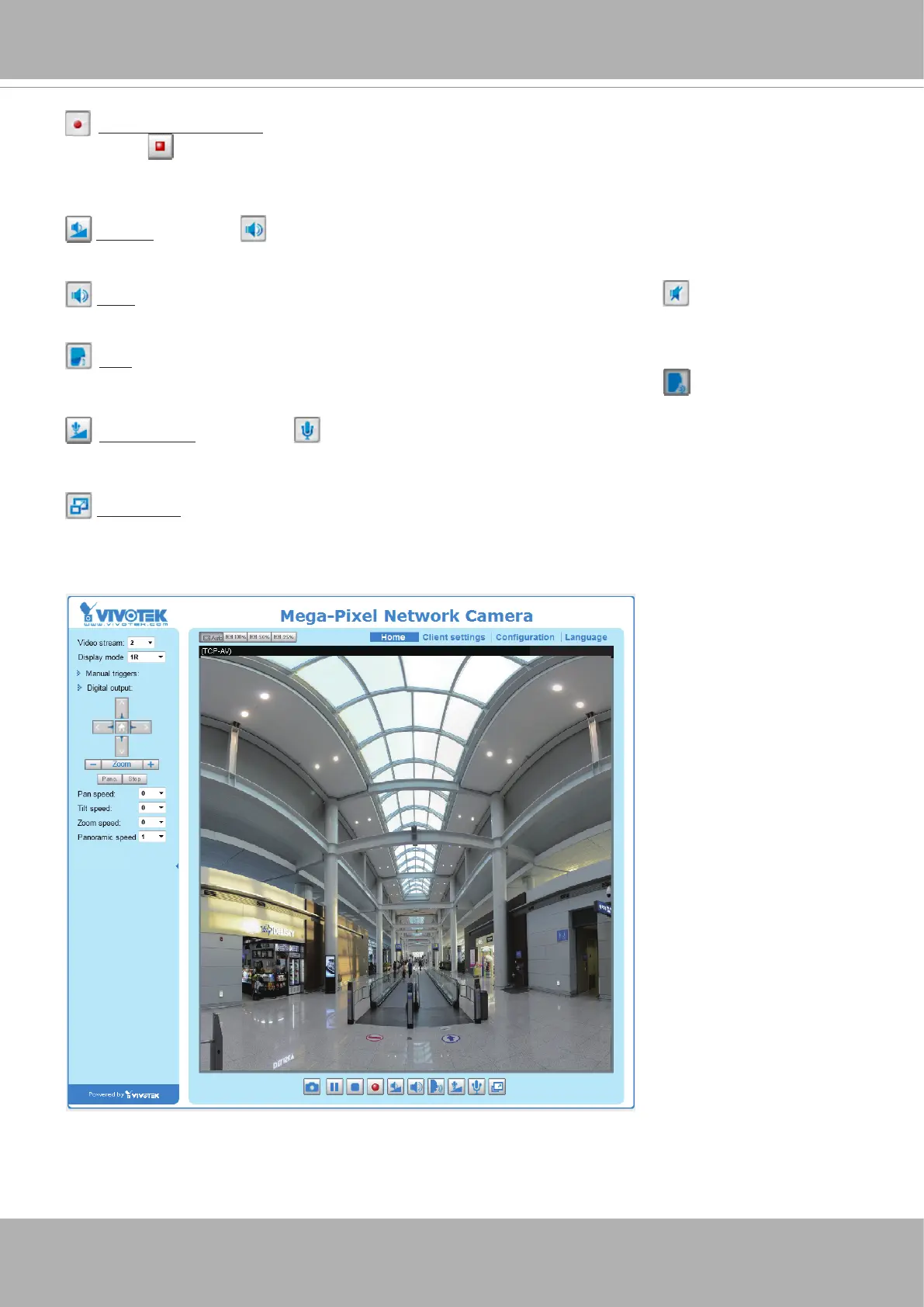 Talk: Click this button to talk to people around the Network Camera. Audio will project from