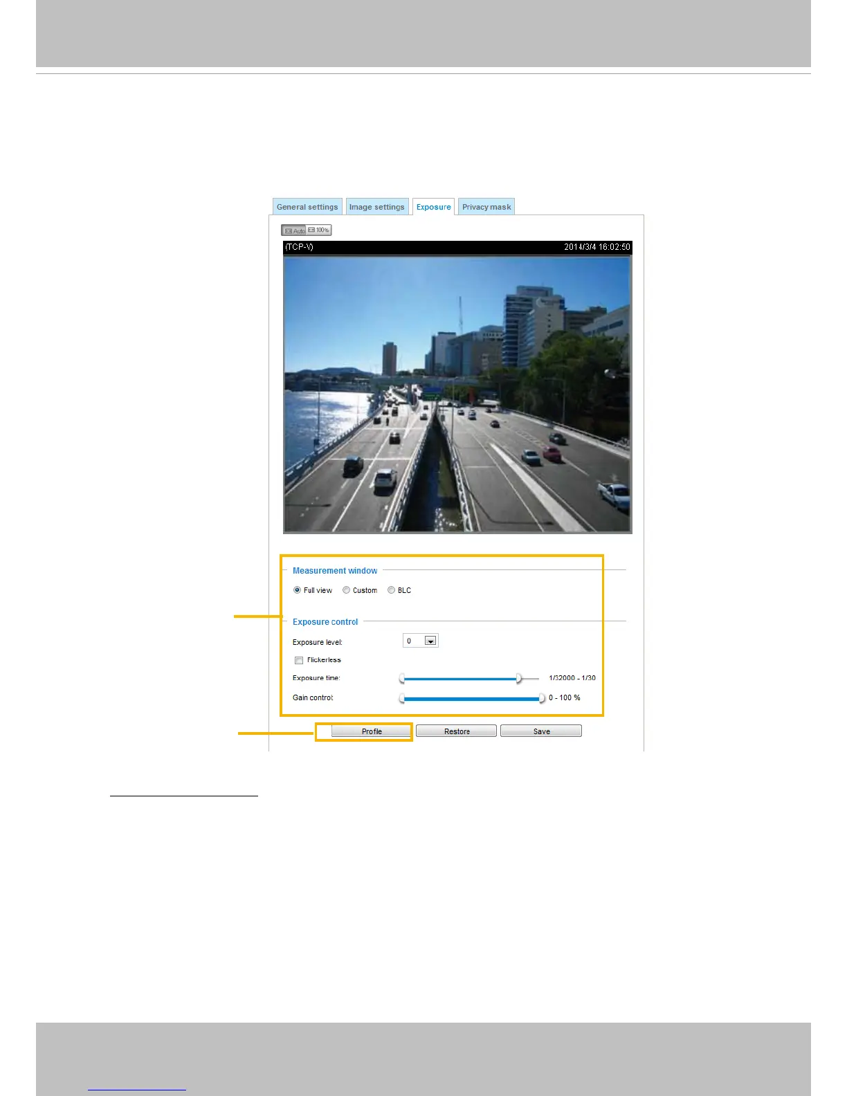 On this page, you can set the Exposure measurement window, Exposure level, Exposure mode,