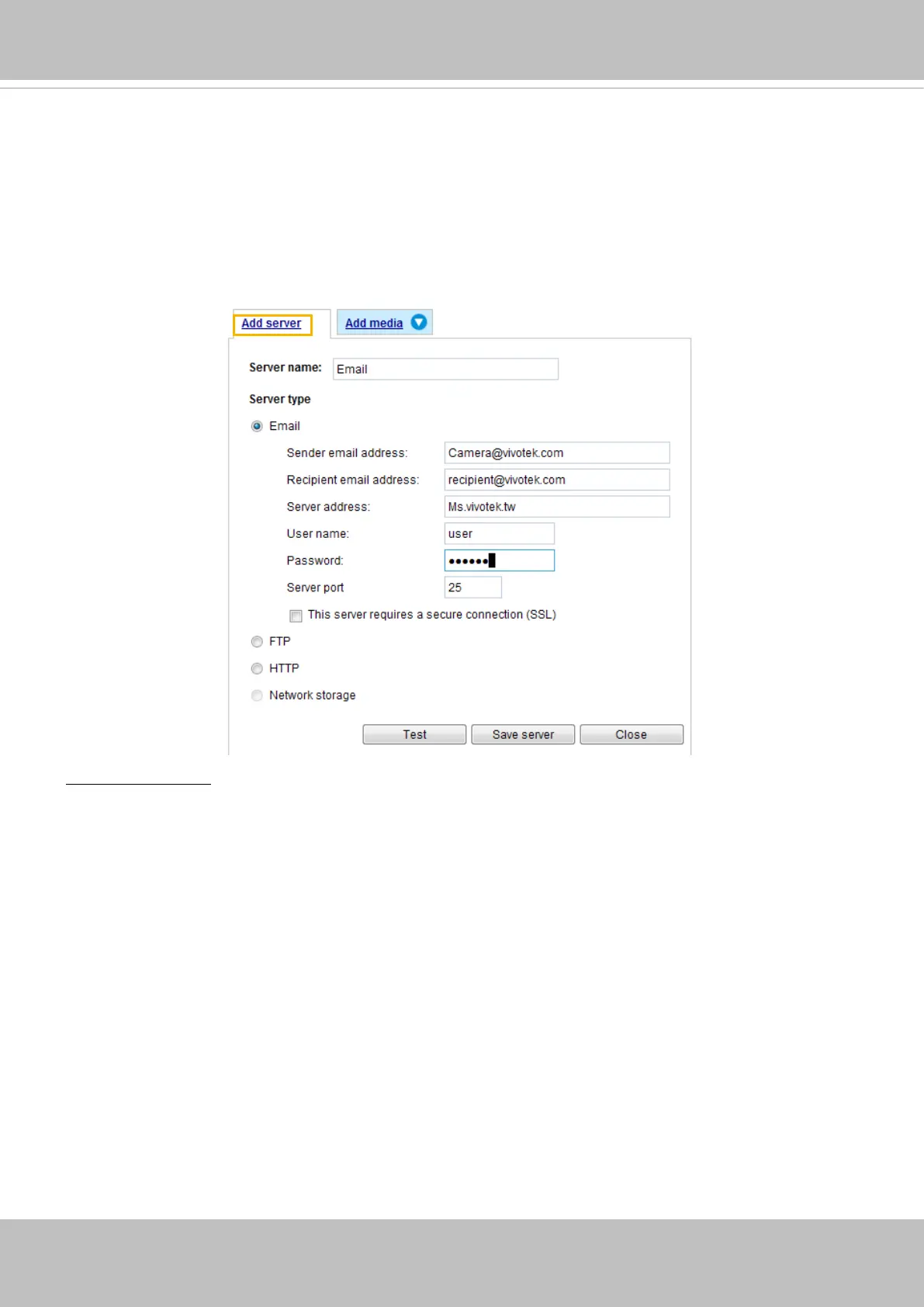 It is necessary to congure the server and media settings so that the Network Camera will know what
