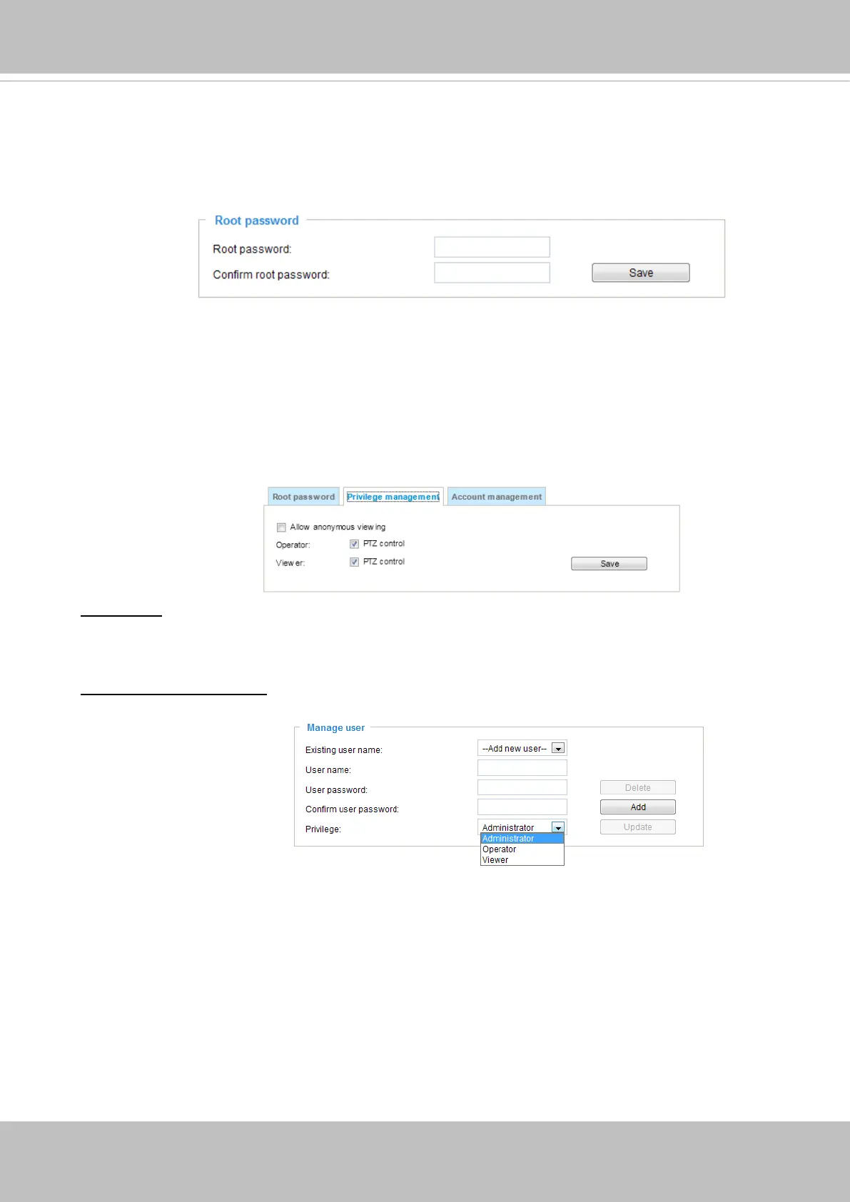 PTZ control: You can modify the management privilege for operators or viewers. Select or deselect