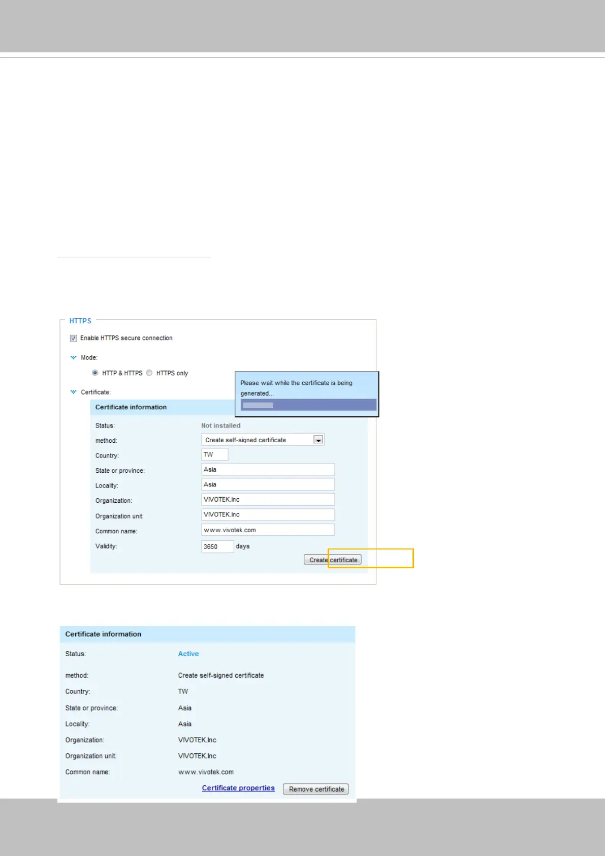 Before using HTTPS for communication with the Network Camera, a Certicate must be created