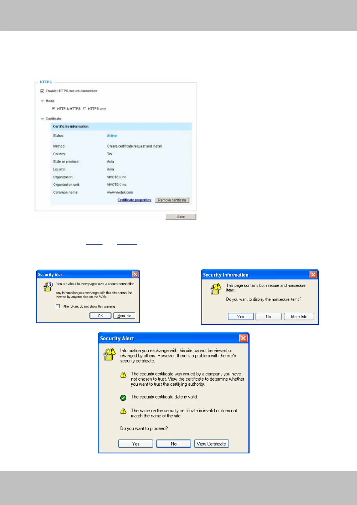 Security Alert dialogs will pop up. Click OK or Yes to enable HTTPS.