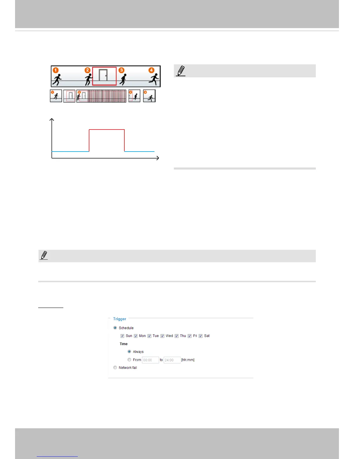 The alarm trigger includes: motion detection and DI detection. Please refer to Event Settings on page 104.