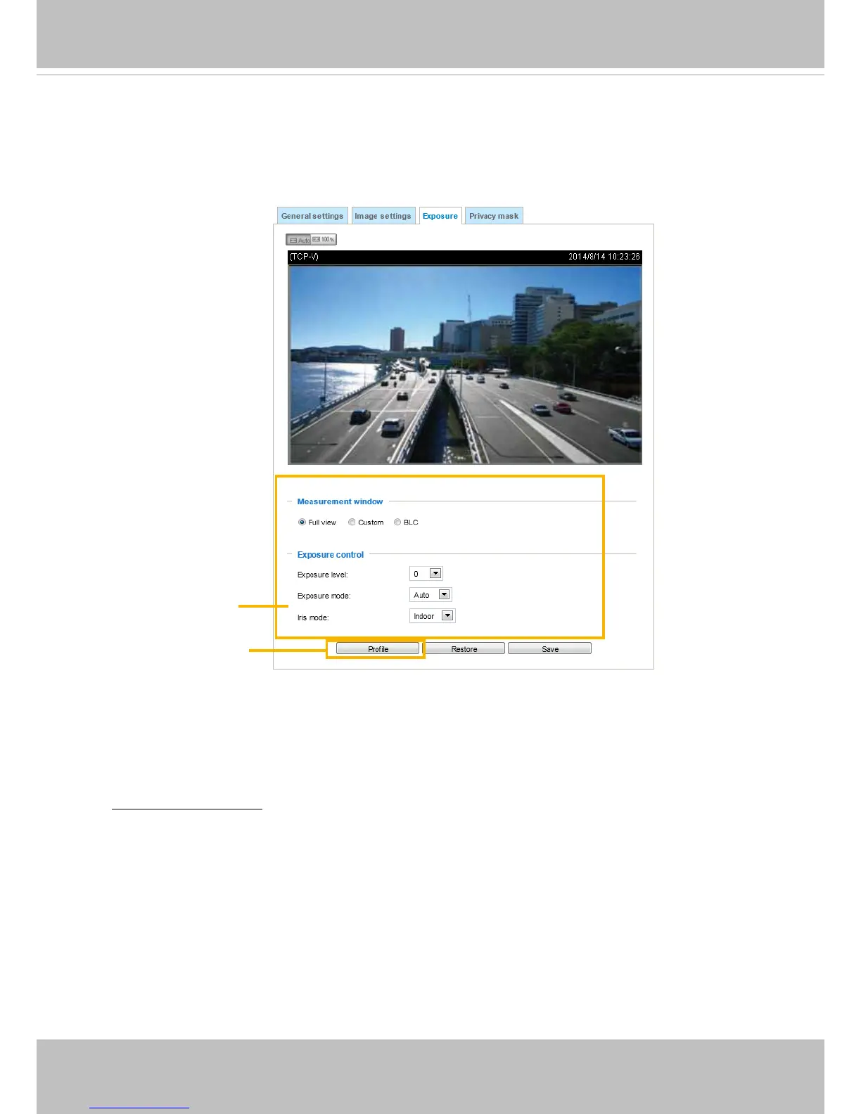 On this page, you can set the Exposure measurement window, Exposure level, Exposure mode,