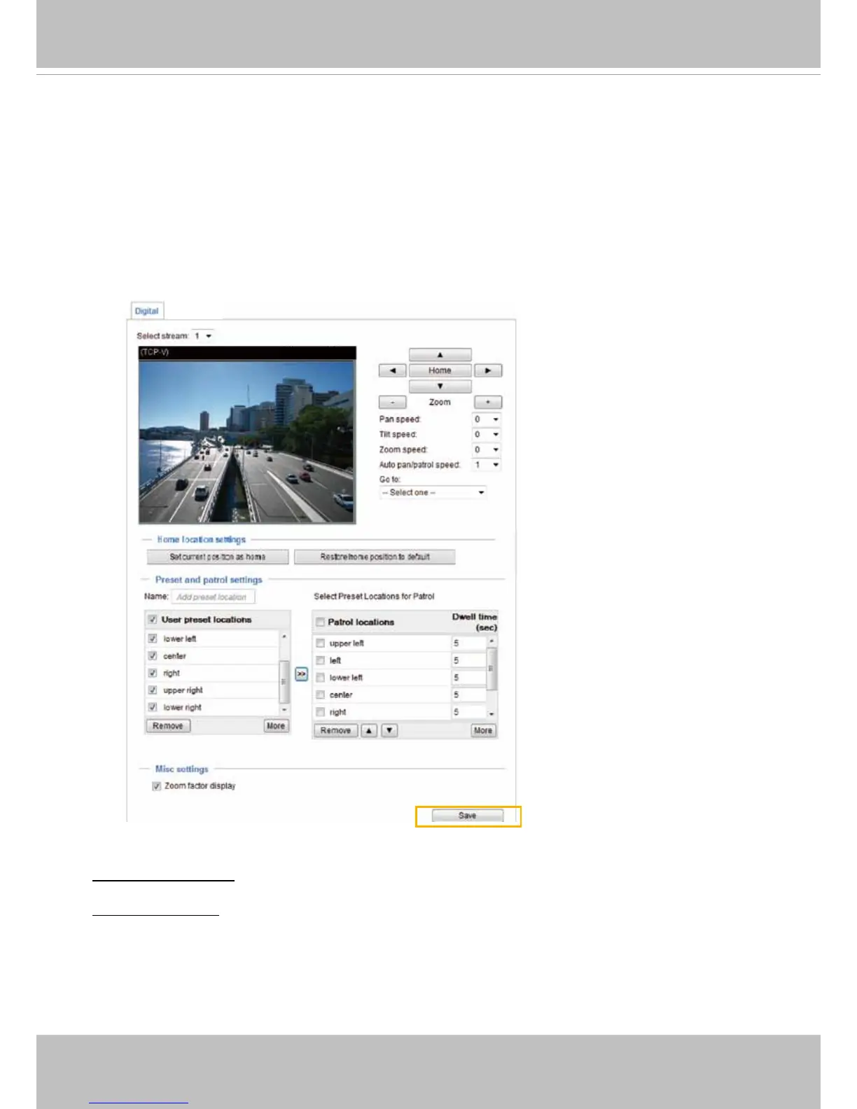 When completed with the e-PTZ settings, click Save to enable the settings on this page.