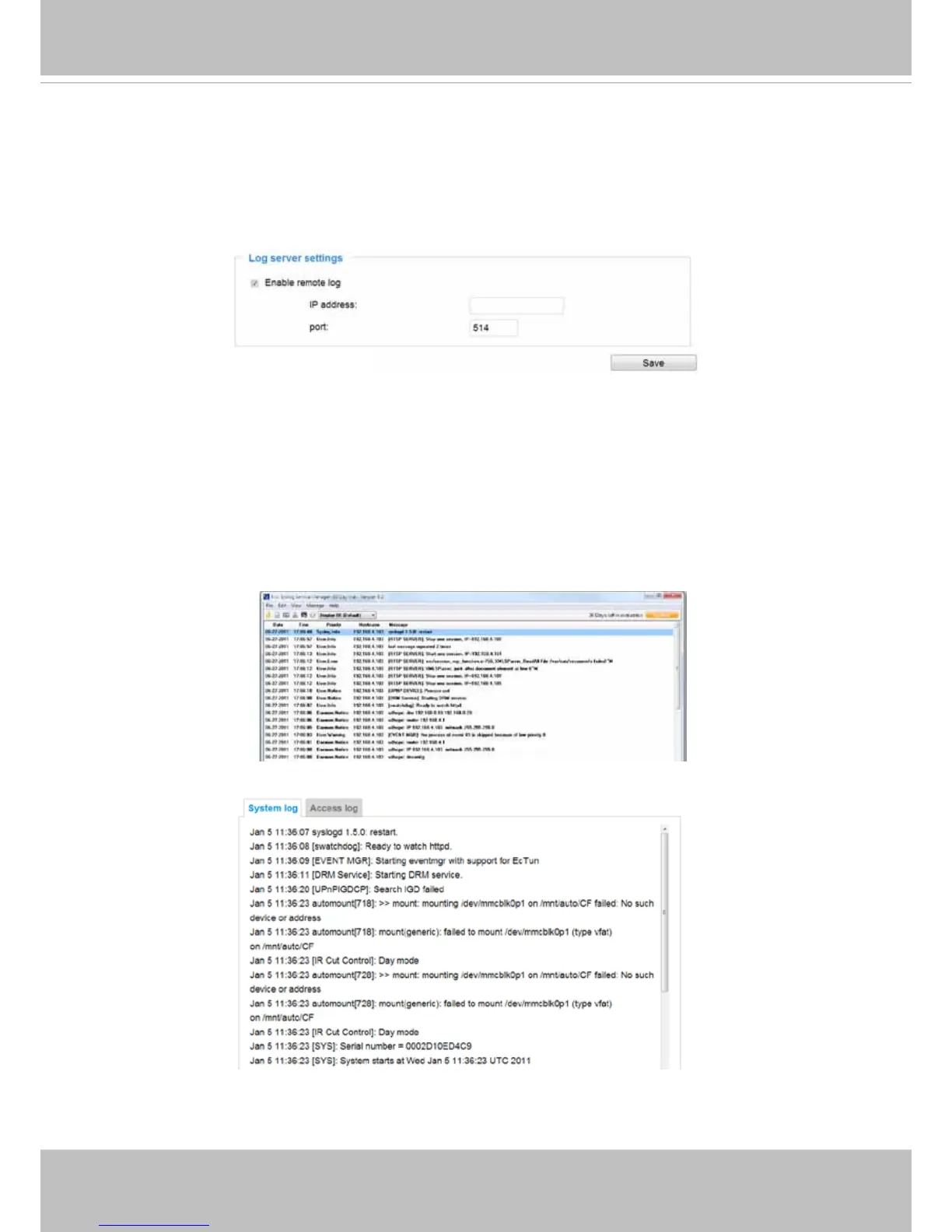 messages from the Network Camera. An example is Kiwi Syslog Daemon. Visit http://www.kiwisyslog.