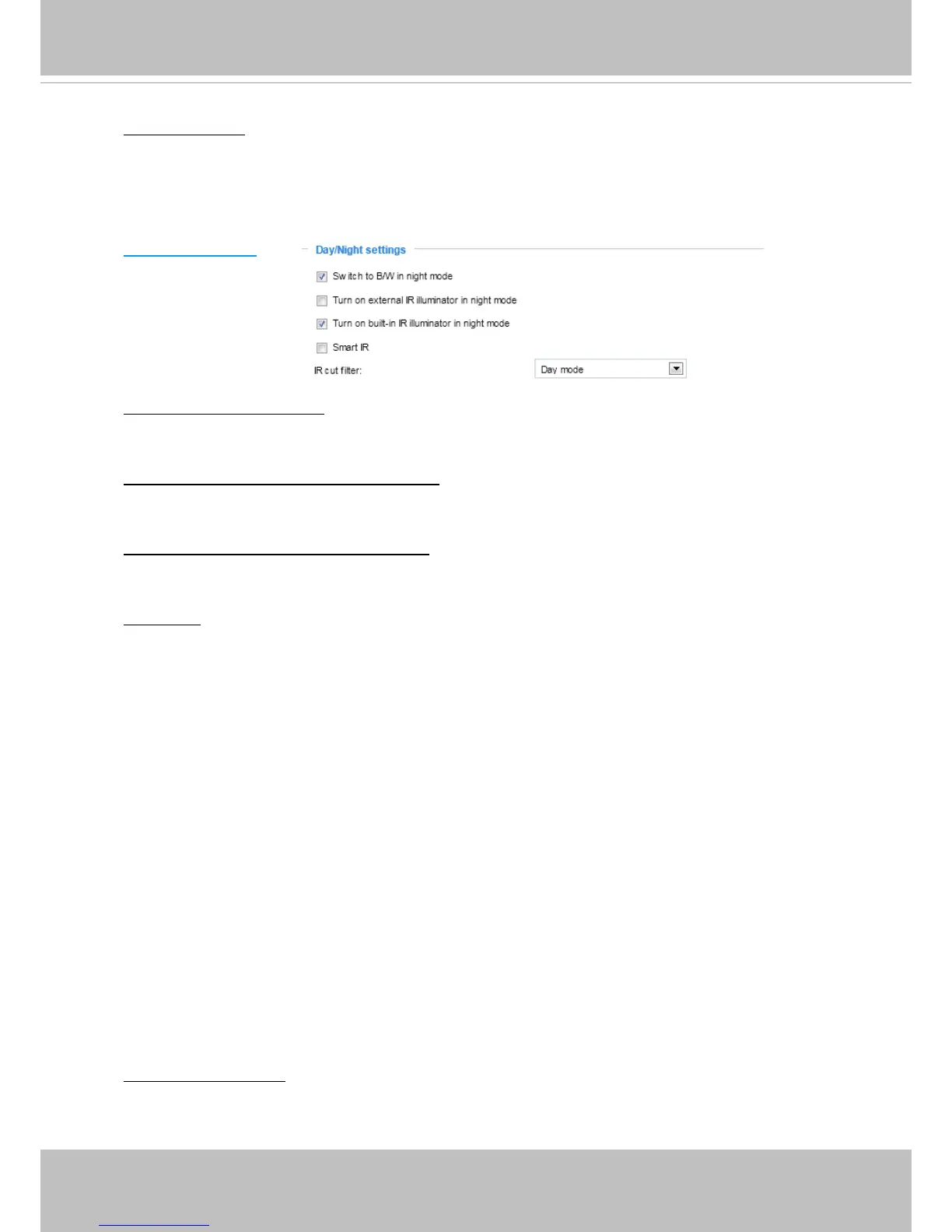 In day mode, the Network Camera switches on the IR cut lter at all times to block infrared light