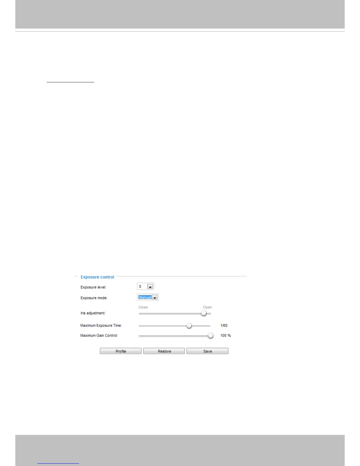 Manual: Select Manual to set a xed exposure time, gain, and iris settings. Then, tune the slide