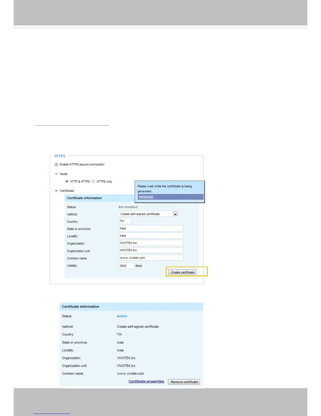 Before using HTTPS for communication with the Network Camera, a Certicate must be created rst.
