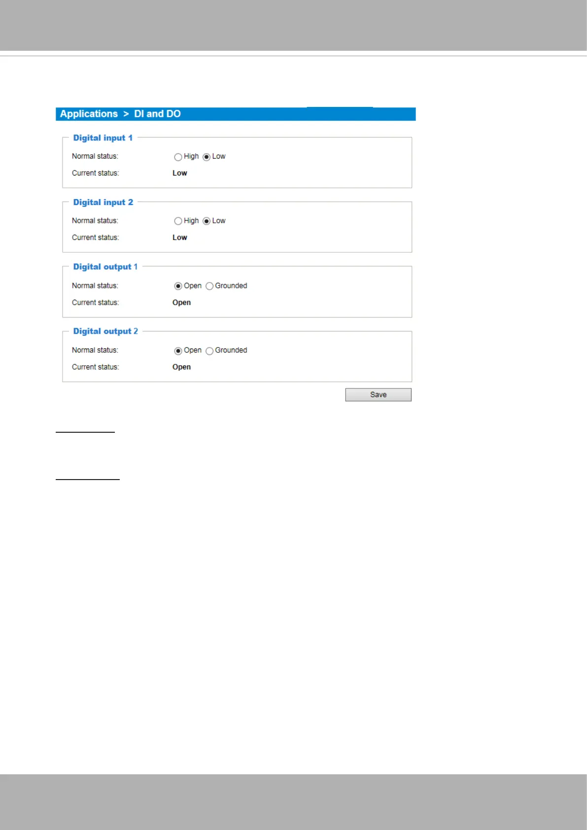 Digital output: Select Grounded or Open to dene the normal status for the digital output. Connect