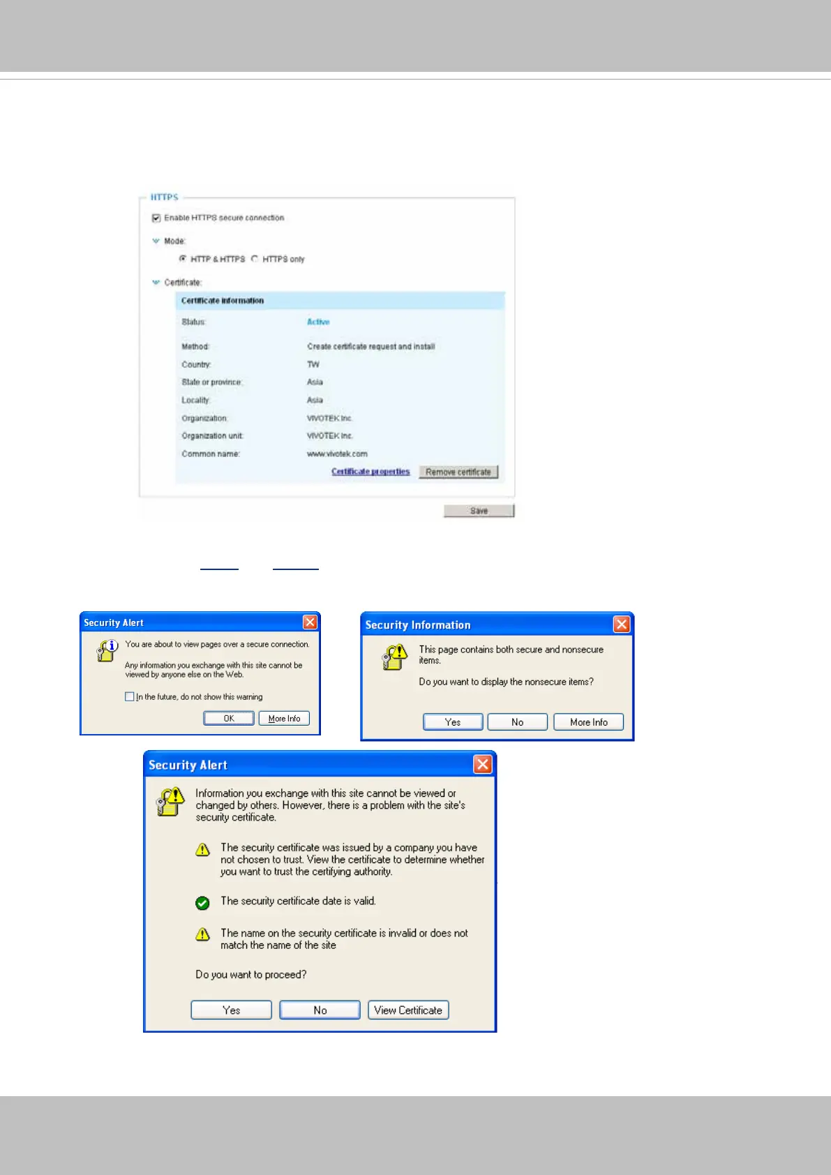 Security Alert dialogs will pop up. Click OK or Yes to enable HTTPS.