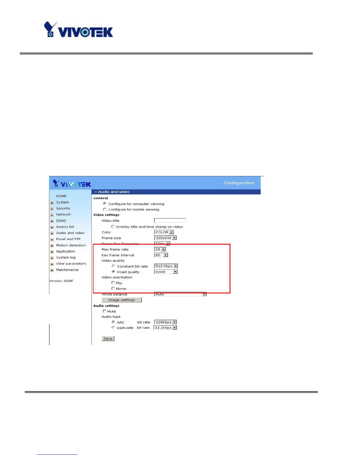 “Maximum frame rate”, “Constant bit rate”, and “Fix quality” on the Audio and Video