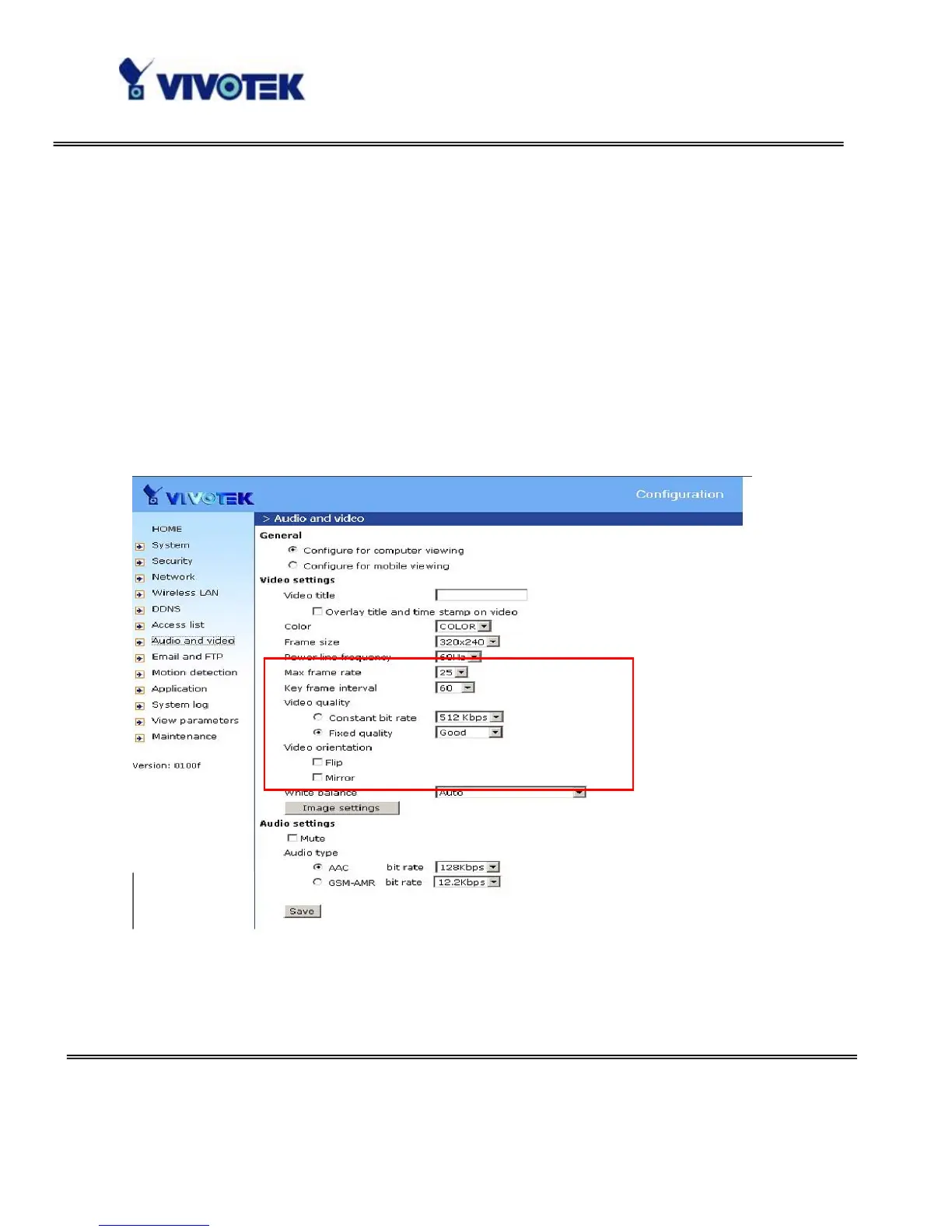 “Maximum frame rate”, “Constant bit rate”, and “Fix quality” on the Audio and Video