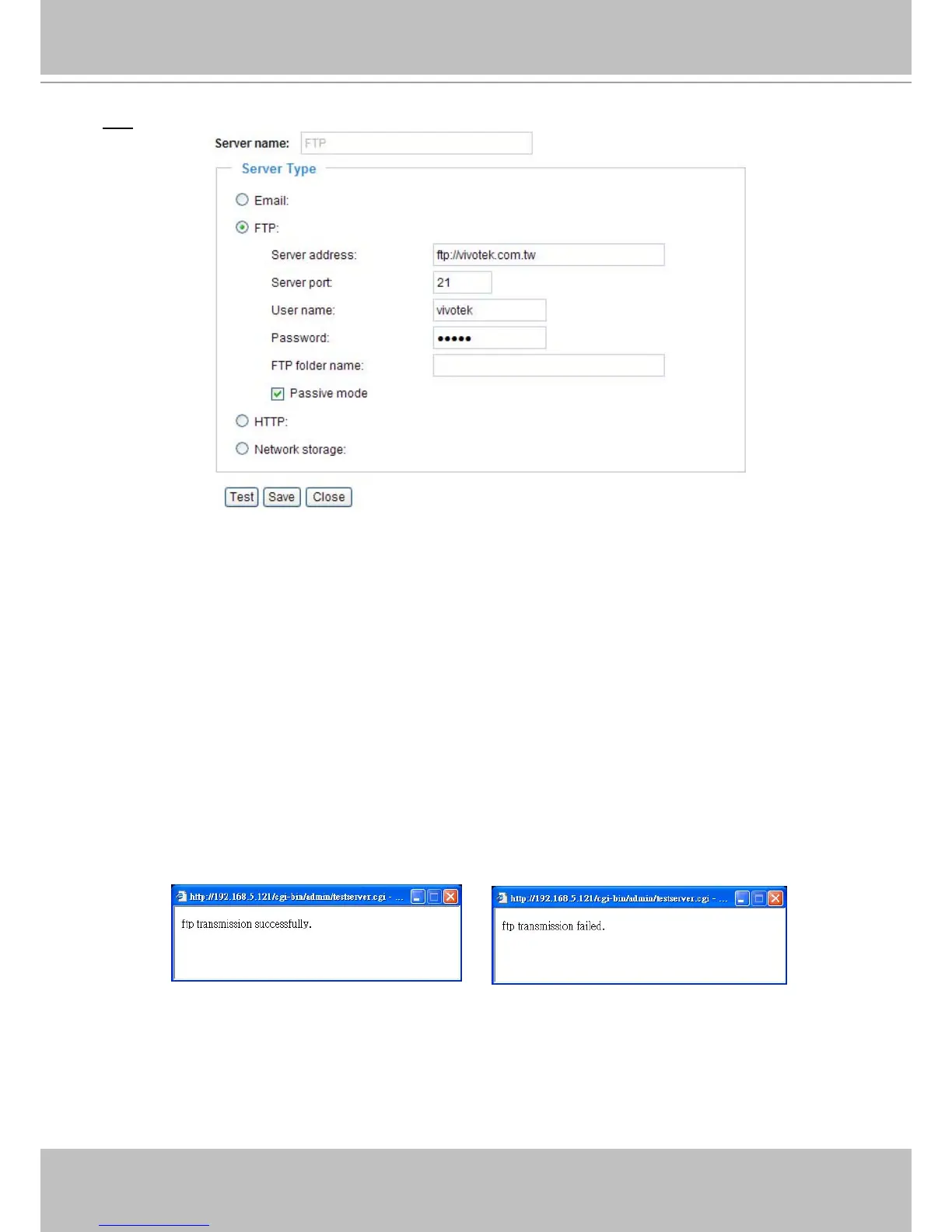 To verify if the FTP settings are correctly congured, click Test. The result will be shown in a pop-up