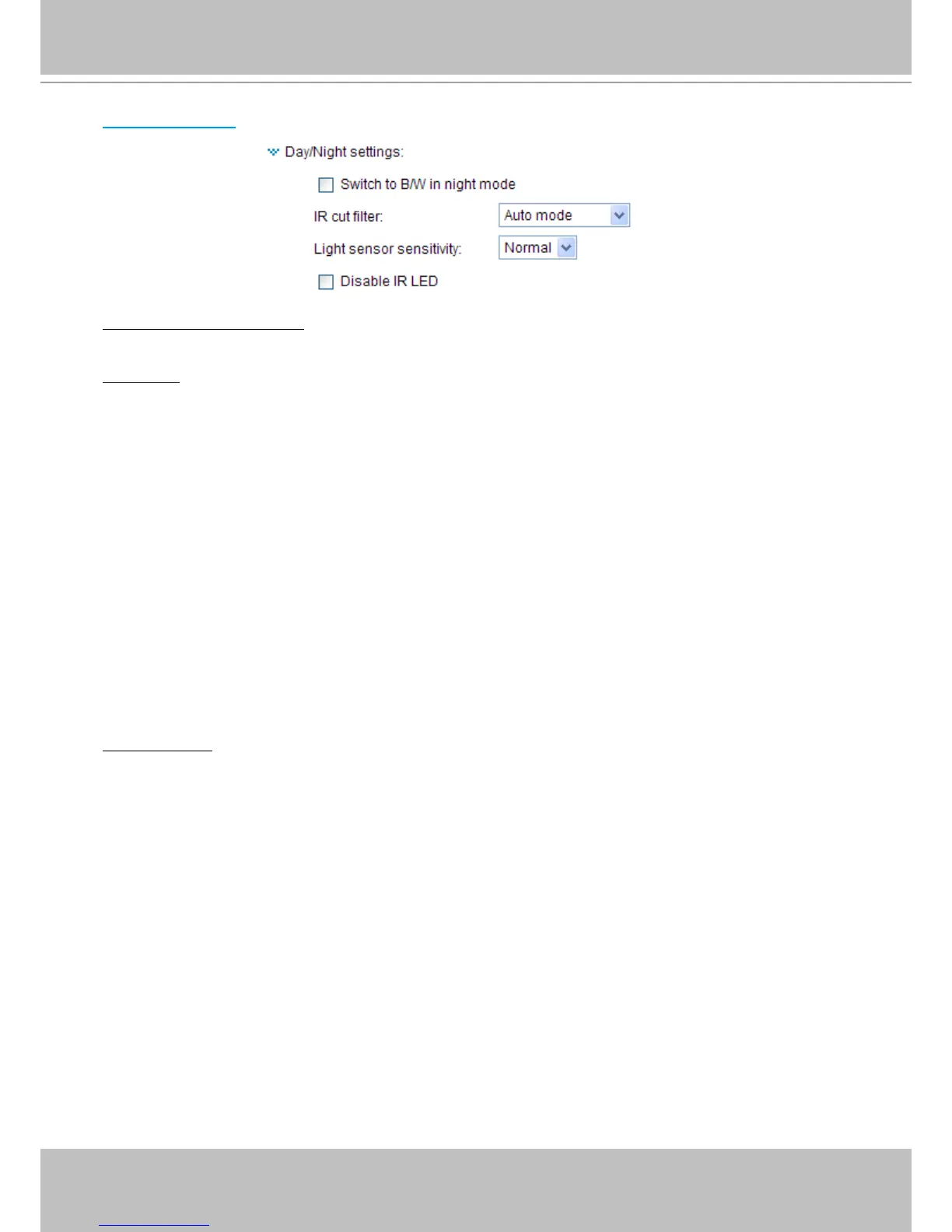 In day mode, the Network Camera switches on the IR cut lter at all times to block infrared light from