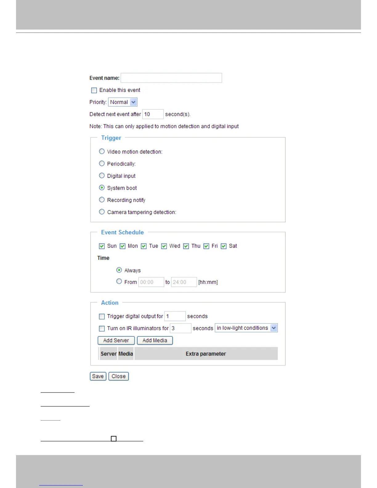 arrange three elements -- Trigger, Schedule, and Action to set an event� A total of 3 event settings can be