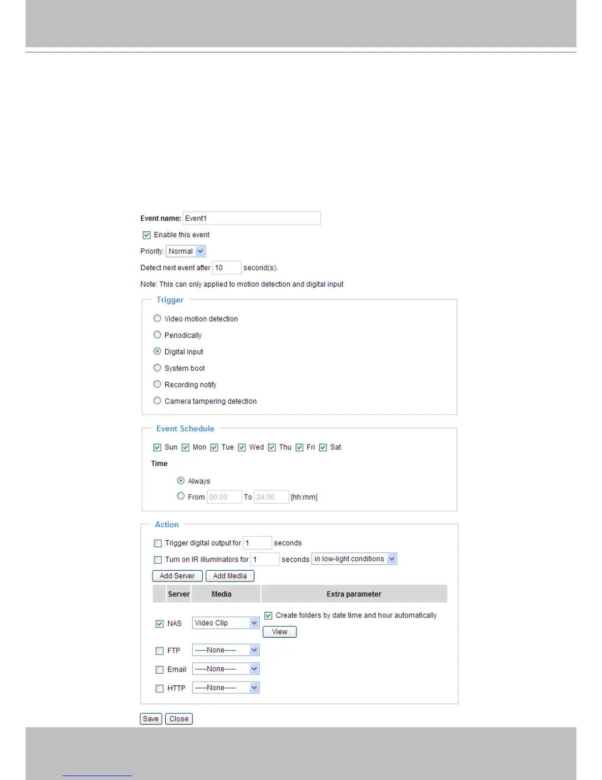 To set an event with recorded video or snapshots, it is necessary to congure the server and