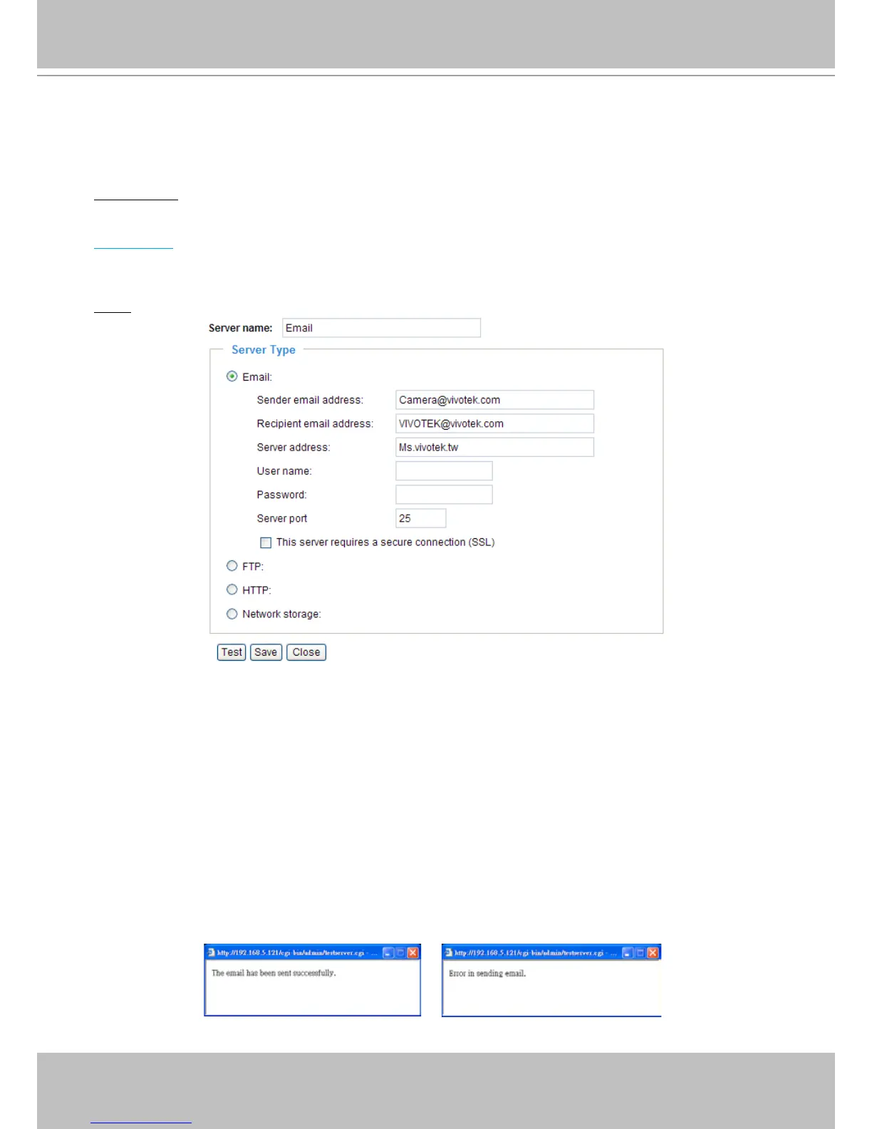 To verify if the email settings are correctly congured, click Test� The result will be shown in a pop-up