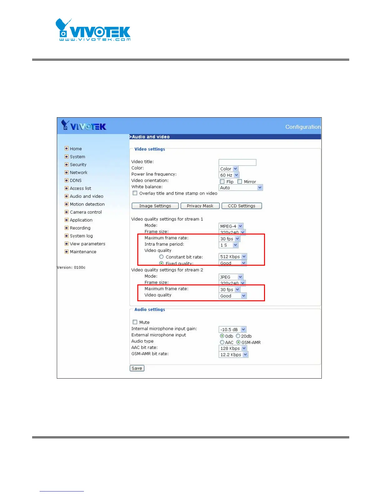 “Maximum frame rate” and “Fix quality” for JPEG mode on the Audio and Video