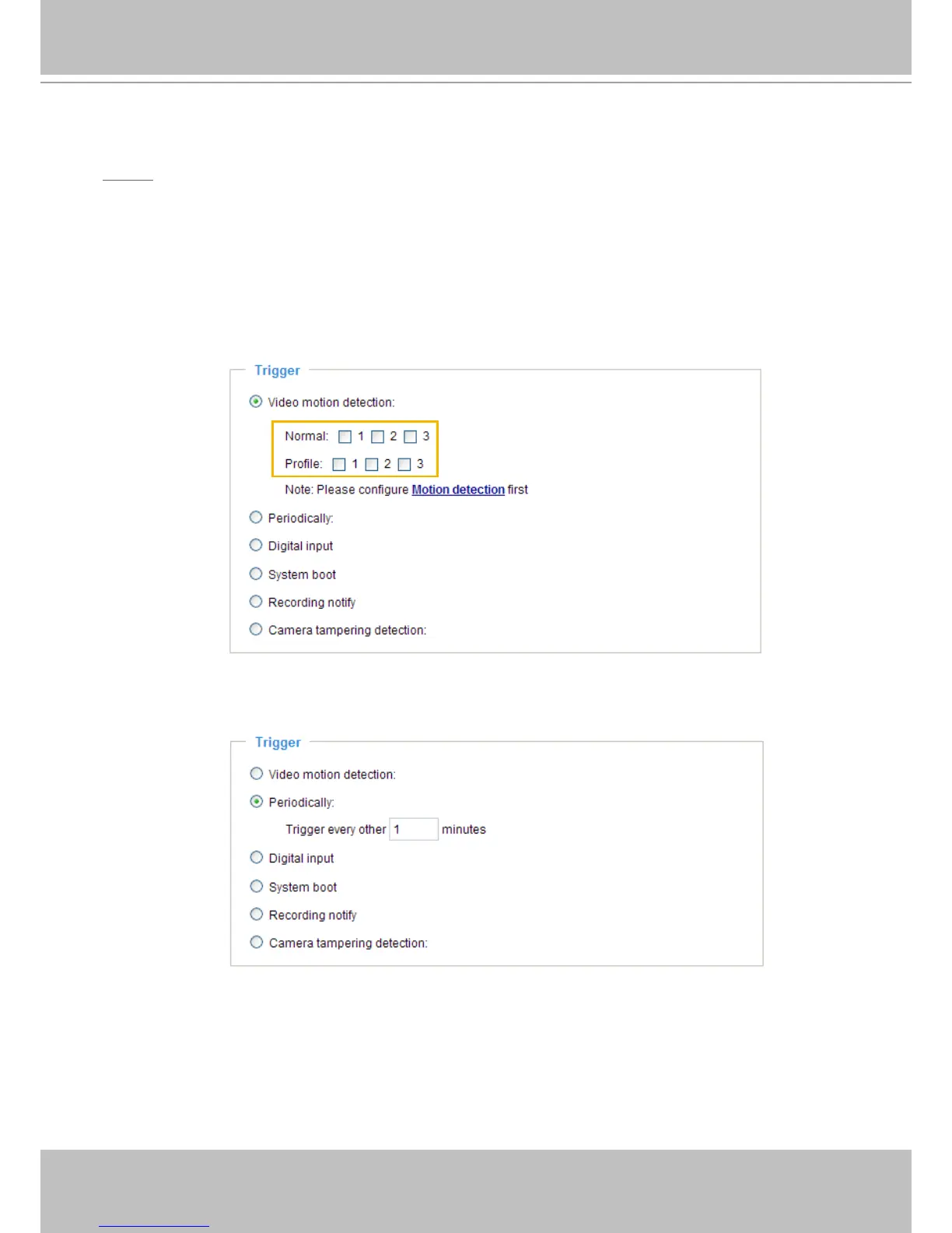 This is the cause or stimulus which denes when to trigger the Network Camera. The trigger source can