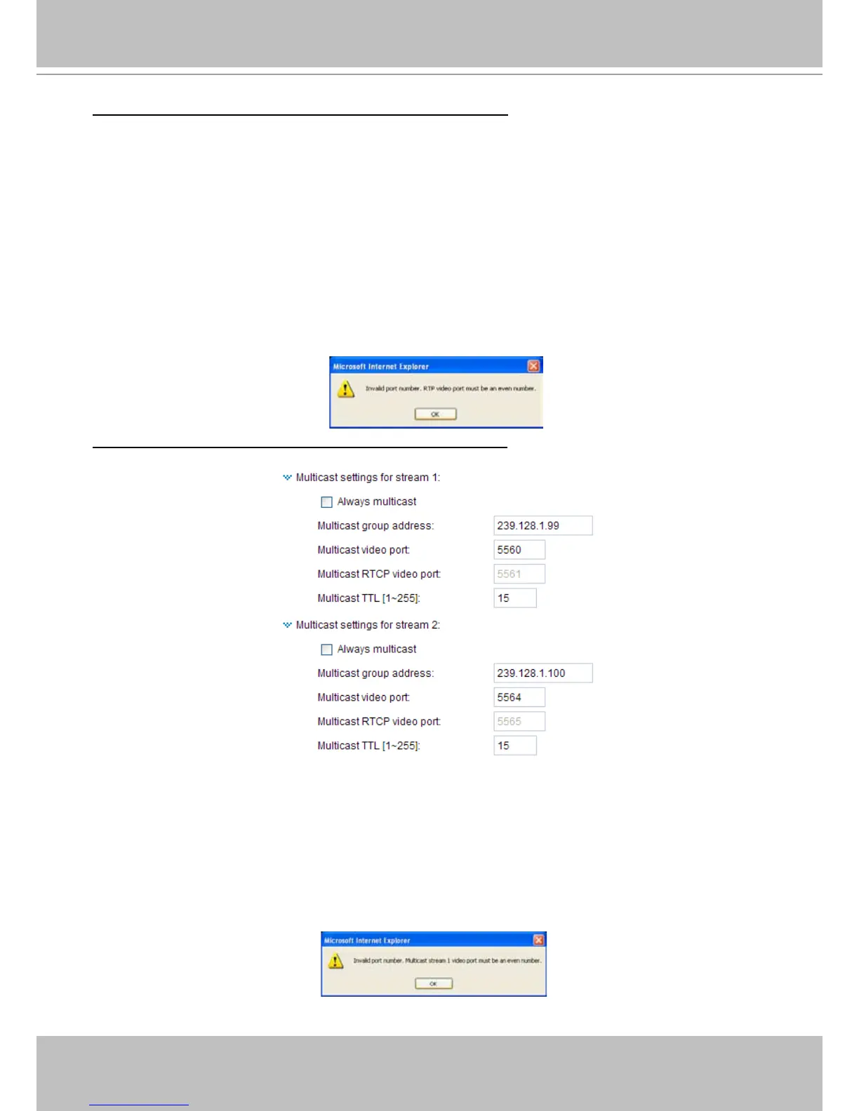 If the multicast RTP video ports are incorrectly assigned, the following warning message will be