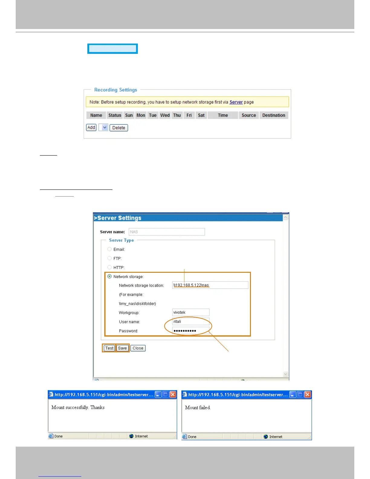 ► Before setting up this page, please set up the Network Storage on the Server Settings page rst.