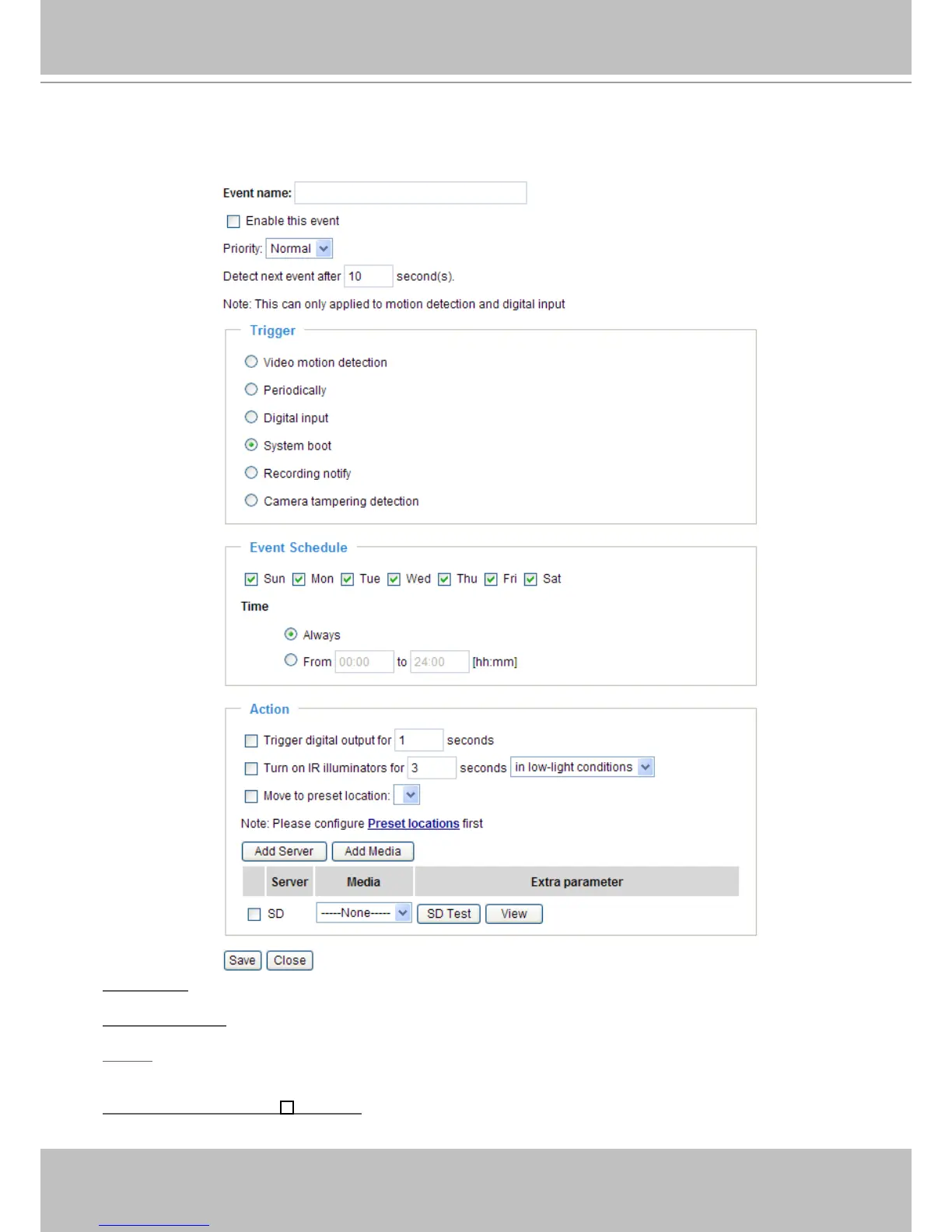 arrange three elements -- Trigger, Schedule, and Action to set an event� A total of 3 event settings can be