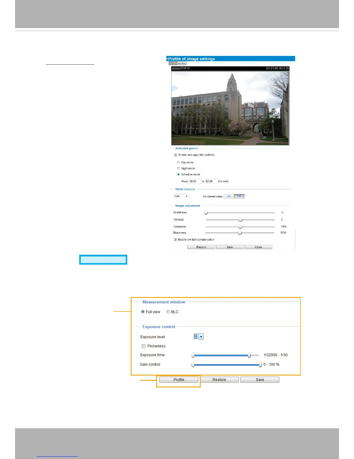 On this page, you can set the Measurement window, Exposure level, Exposure time, and Gain