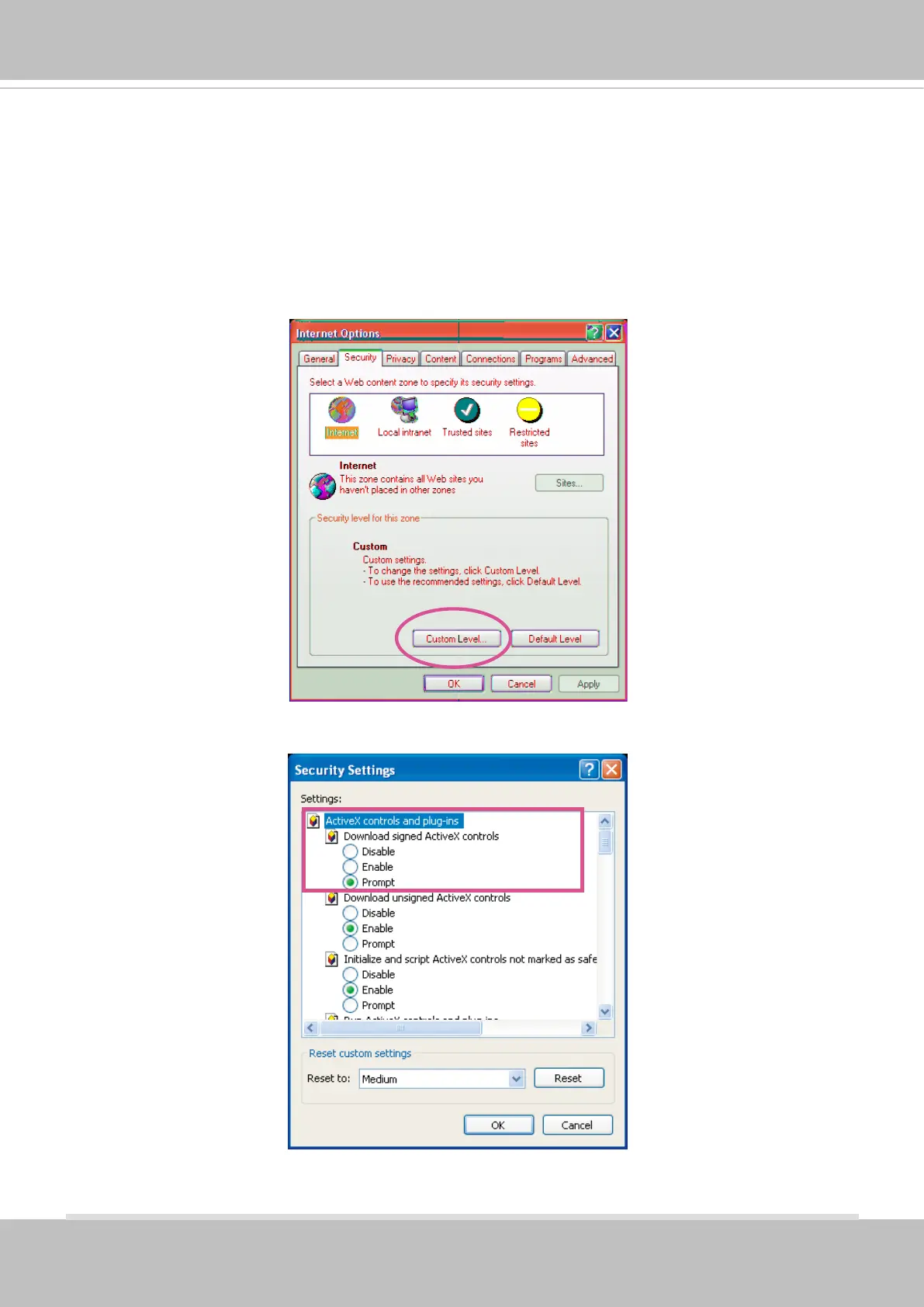 ► If you see a dialog box indicating that your security settings prohibit running ActiveX