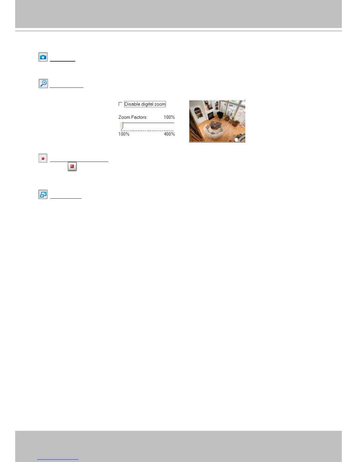 Snapshot: Click this button to capture and save still images. The captured images will be displayed