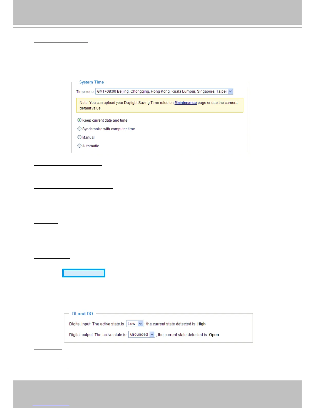 Digital input: Select High or Low to dene normal status for the digital input. The Network Camera will