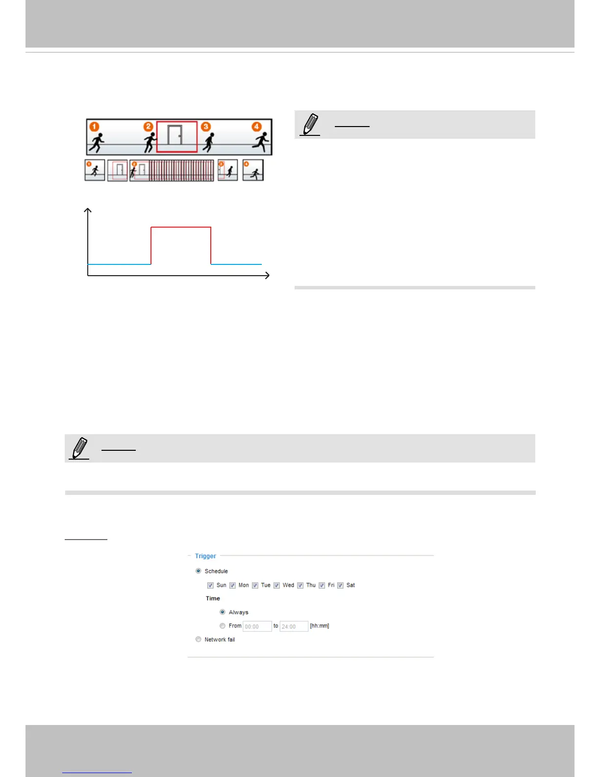 The alarm trigger includes: motion detection, tampering detection, and DI detection. Please refer to Event