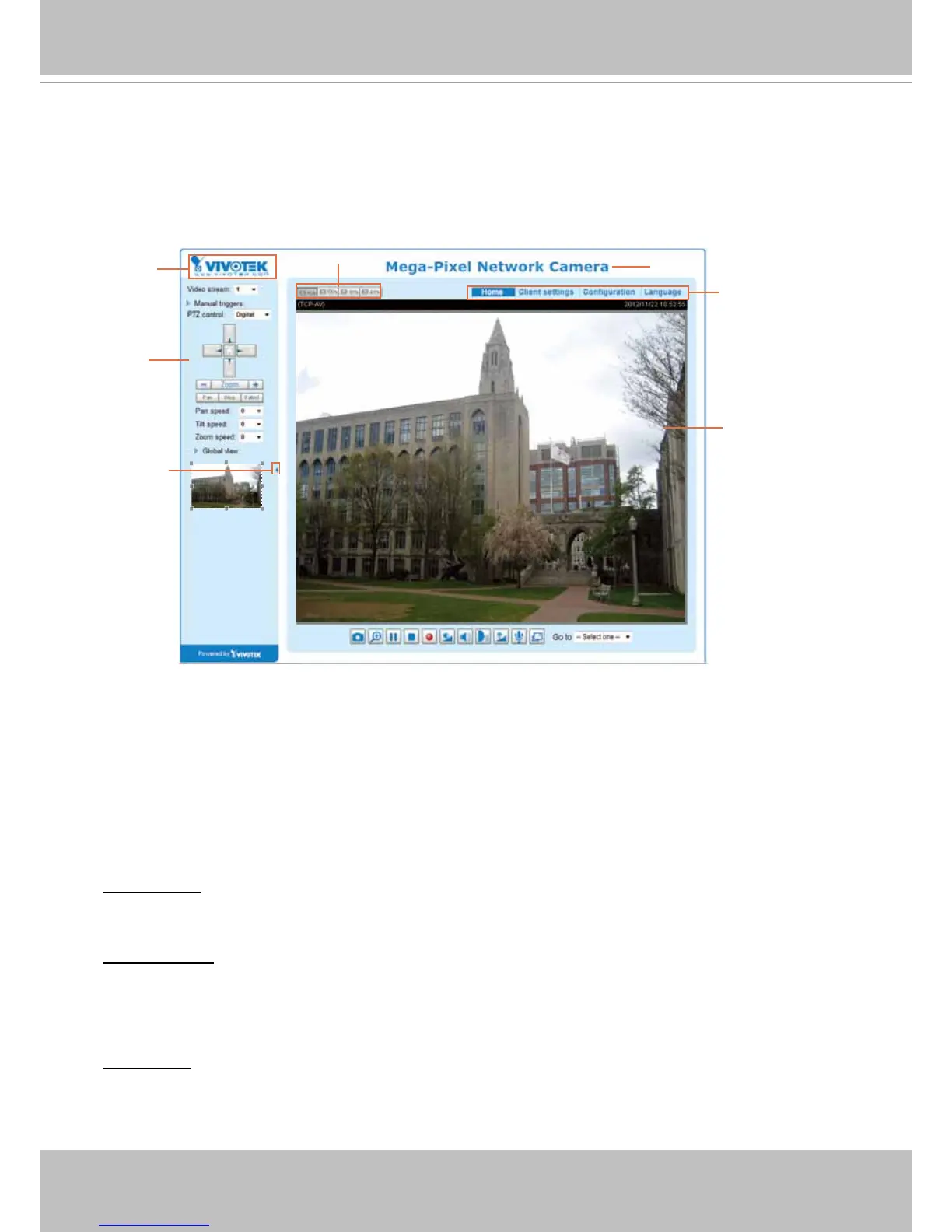 VIVOTEK INC� Logo, Host Name, Camera Control Area, Configuration Area, Menu, and Live