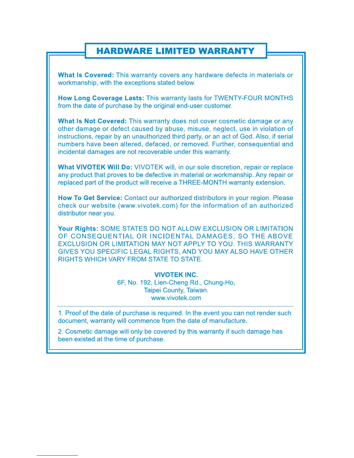 Vivotek ip8155hp - Hardware Limited Warranty; Warranty Coverage Details