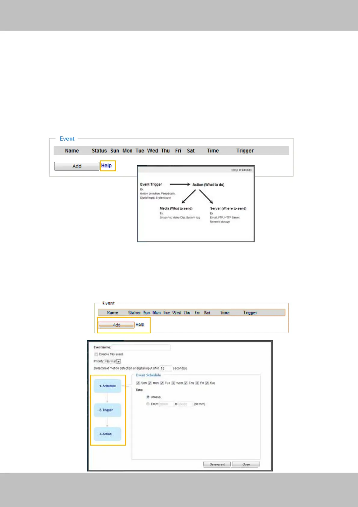 can arrange three elements -- Schedule, Trigger, and Action to set an event. A total of 3 event settings