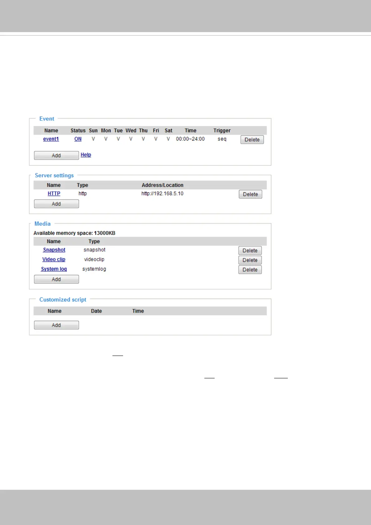 In the Event settings column, the Servers and Medias you congured will be listed; please make sure the