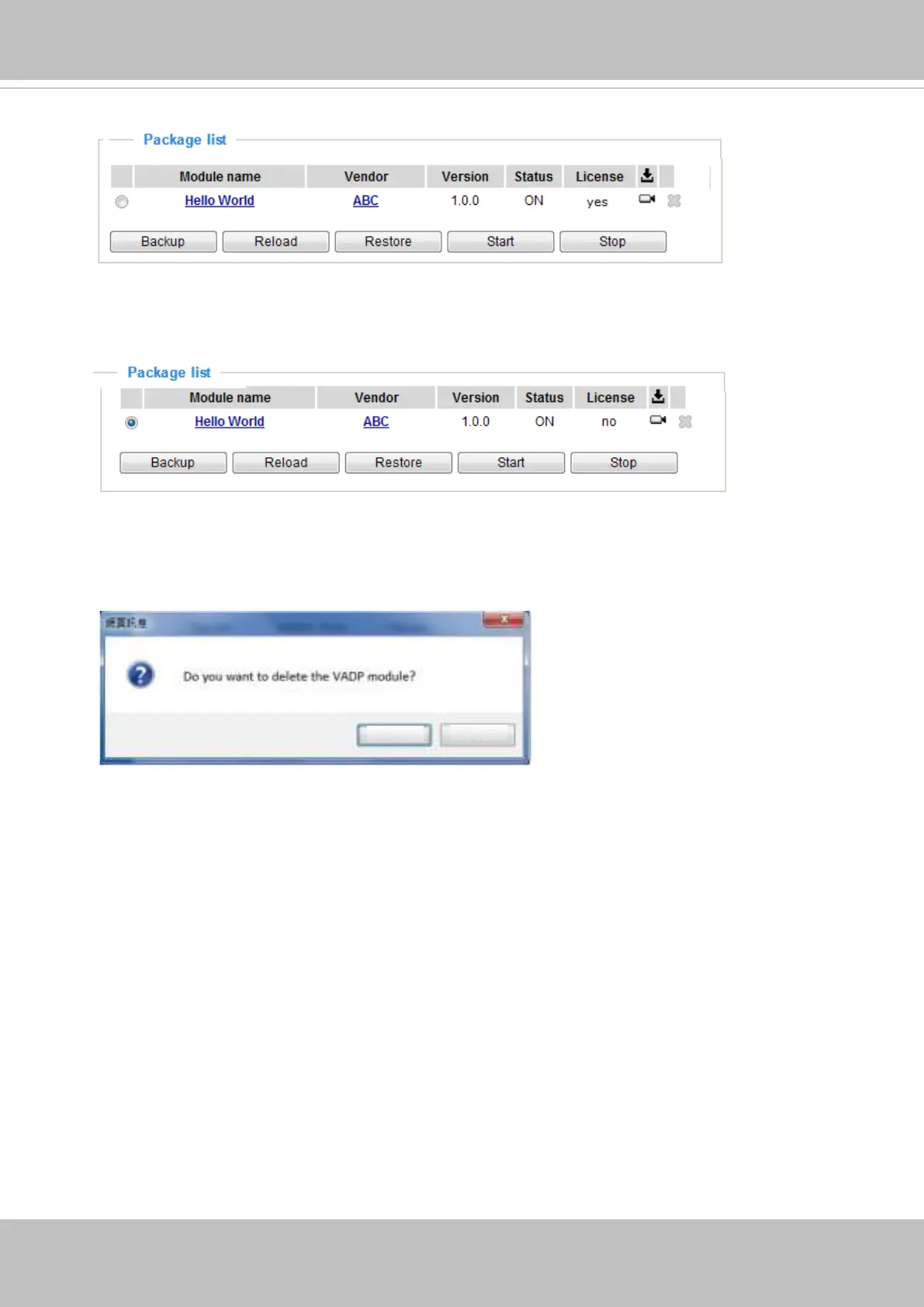 Stop button. By then the module status will become OFF, and the X button will appear at